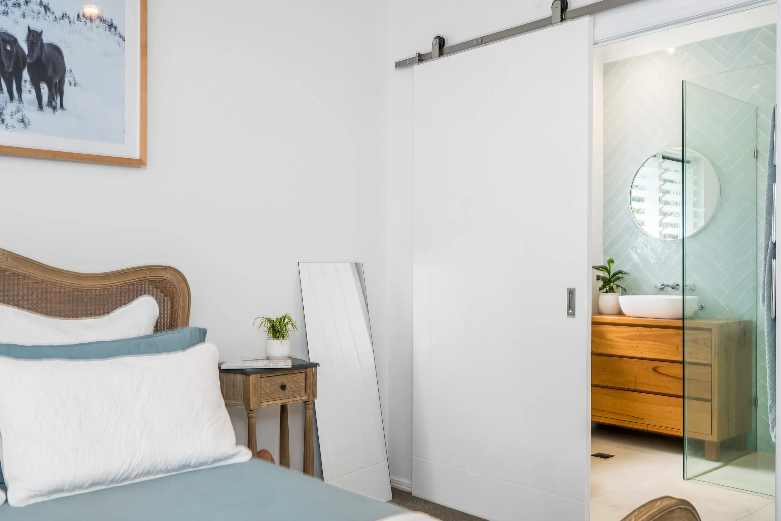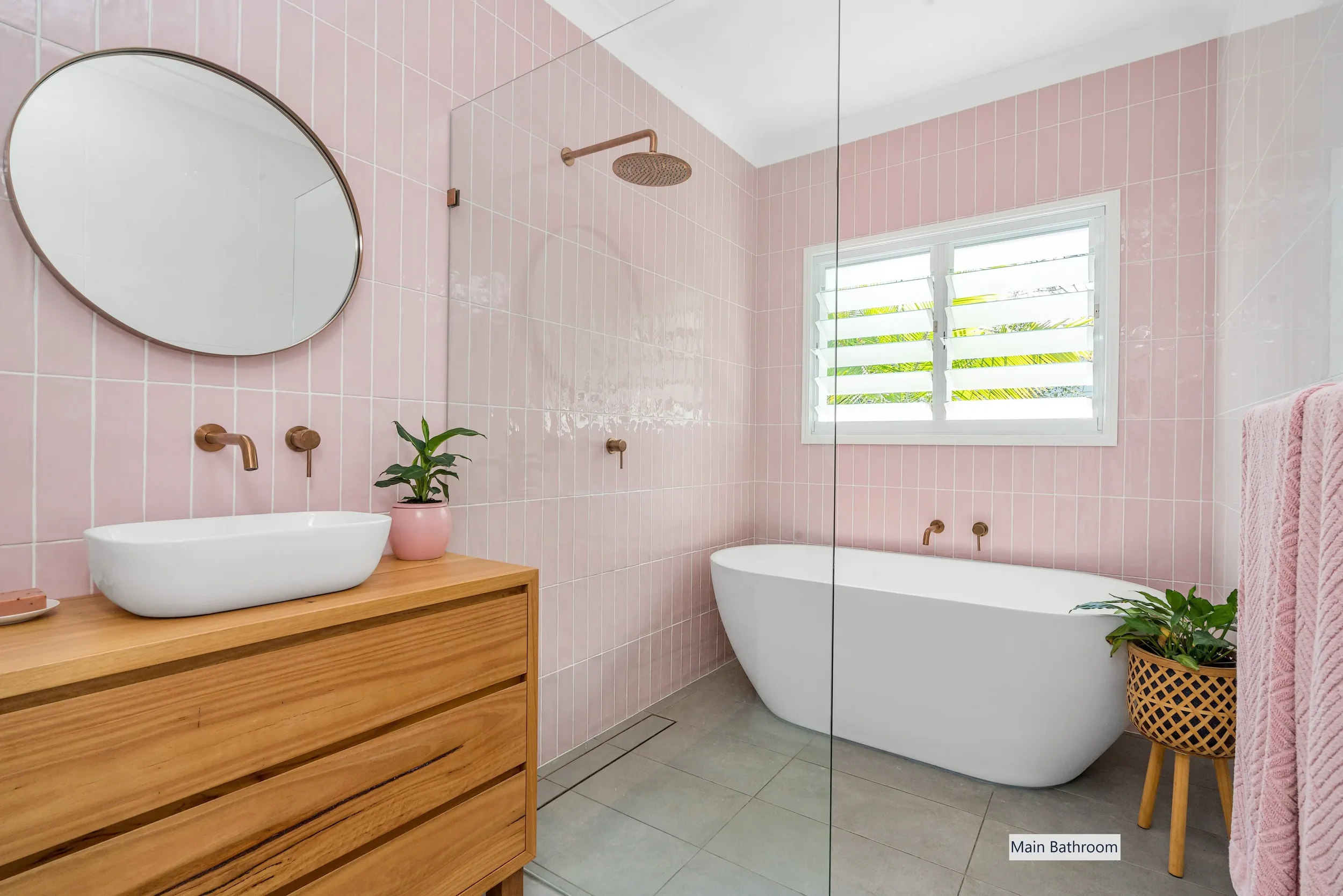 Each of the four carpeted bedrooms offers a peaceful retreat, while the bathrooms are beautifully finished with feature pastel tiles that evoke a playful Palm Springs aesthetic. Set on a generous 633m² block with bananas, olives, figs, and flowering natives, the home sits within a friendly neighbourhood just five minutes from local schools, markets, and Bangalow's main street. A home of warmth, character, and effortless style, ready to embrace its next chapter.